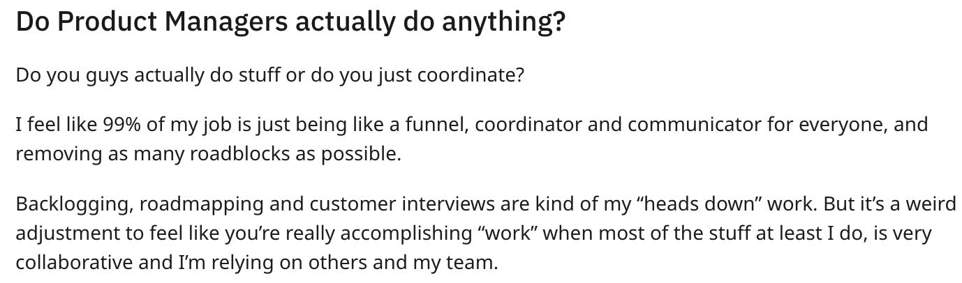 Other than the weekly impostor syndrome, most product forums are filled with queries such as this example from r/ProductManagement